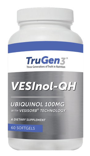 Most CoQ10 supplements are known for their poor bioavailability and they must be taken with a high-fat meal for increased effectiveness. CoQ10 has very low aqueous solubility and a relatively high molecular weight, meaning it’s poorly absorbed after oral administration. To overcome this problem, TruGen3 has formulated Vesitrol-QH using the VESIsorb® Technology for superior bioavailability.