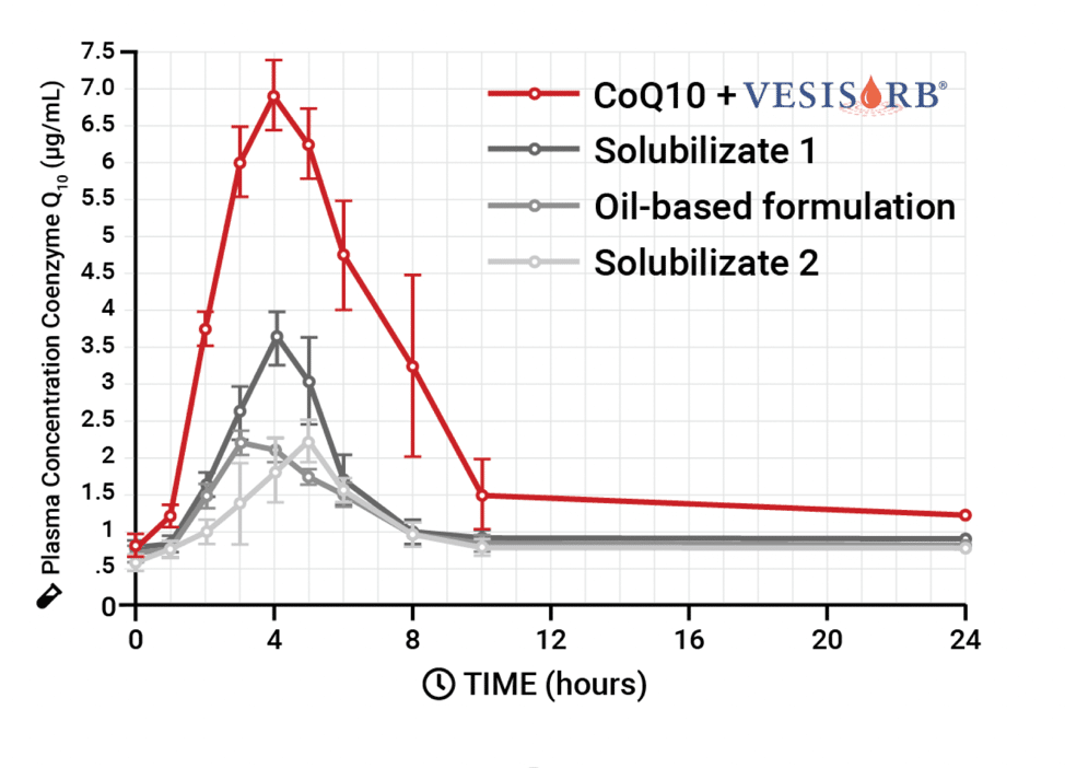 Comparing the bioavailability of a VESIsorb® CoQ10 formulation with 3 other commercially available CoQ10 products.12 The double-blind, controlled study included 20 healthy male and female subjects who took a single-dose (120 mg) of CoQ10. Plasma concentration of CoQ10 was measured at baseline and at intervals after administration over 24 hours. The VESIsorb® CoQ10 led to the highest plasma concentration levels after 1 hour and continued to increase for 4 hours. The concentration of VESIsorb® CoQ10 remained well above the levels of the 3 other products throughout the 24-hour period.